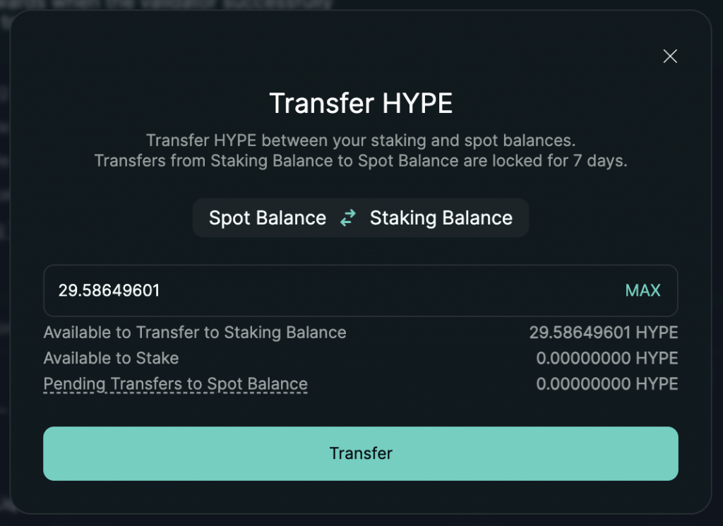 - 转入质押余额: 将 HYPE 从您的现货余额转入您的质押余额。