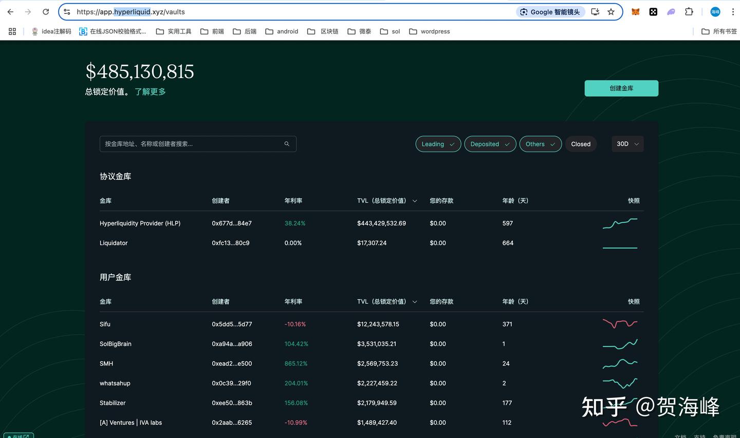 五、【金库】金库可以当前hyperliquid锁定的数字货币总价值,清晰透明。任何人都可以创建金库,金库有点像目前的基金,每个人都可以创建金库,创建者通过管理金库获得10%的利润分享。